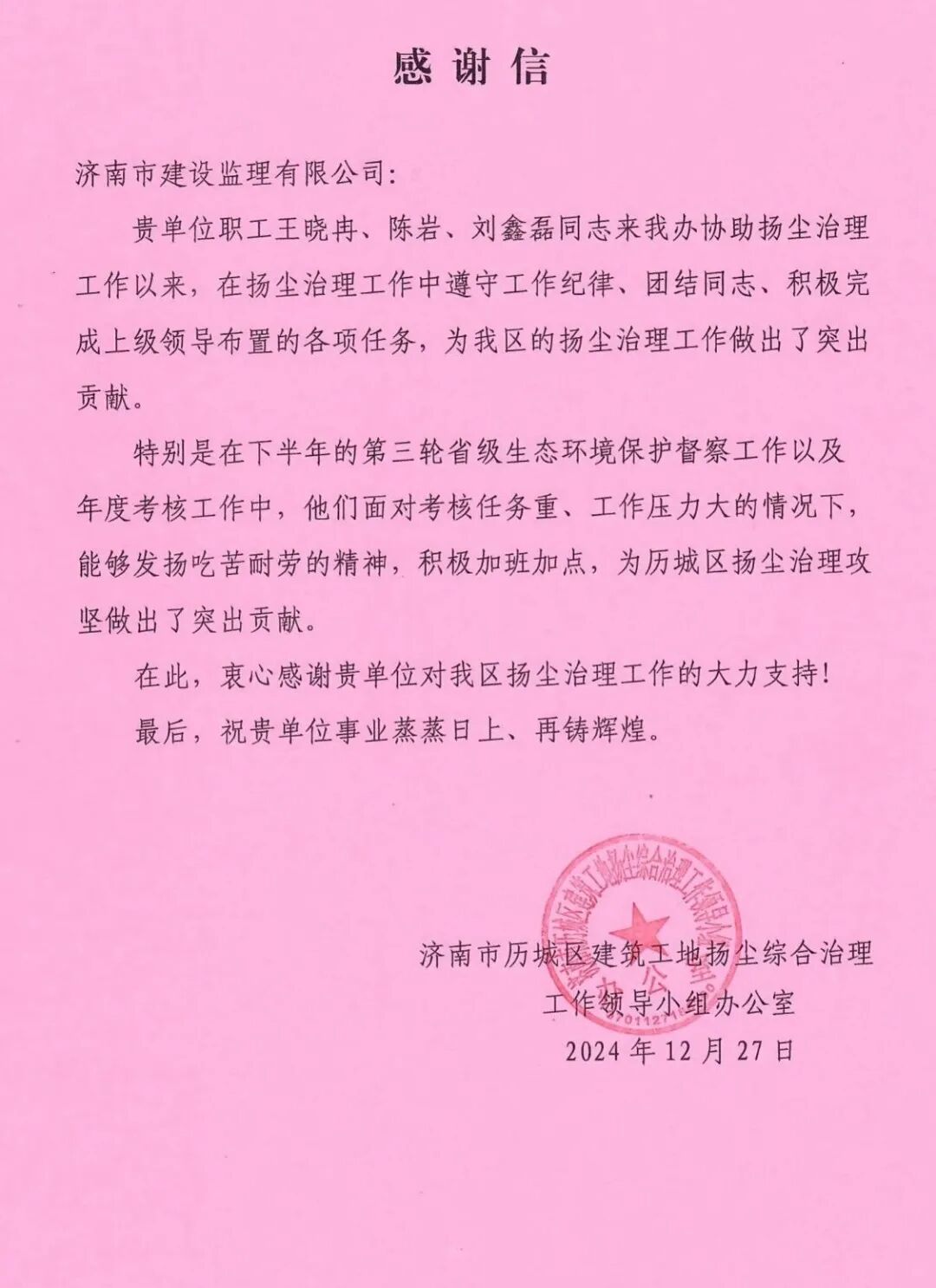 近日,我公司歷城區(qū)住建局第三方巡檢項目收到了來自歷城區(qū)建筑工地?fù)P塵綜合治理工作領(lǐng)導(dǎo)小組辦公室表揚信,信中對我公司項目工作人員的業(yè)務(wù)水平、責(zé)任心、組織協(xié)調(diào)能力給予充分肯定。