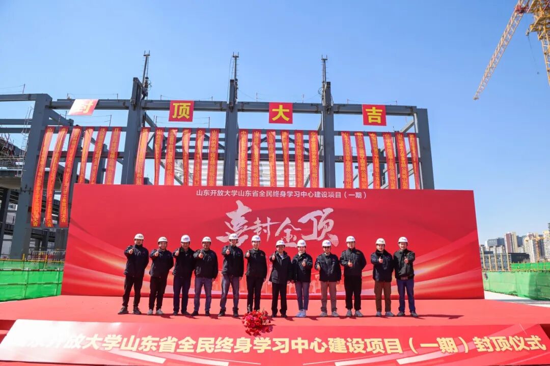 喜封金頂——山東開(kāi)放大學(xué)山東省全民終身學(xué)習(xí)中心建設(shè)項(xiàng)目(一期)文體館順利封頂